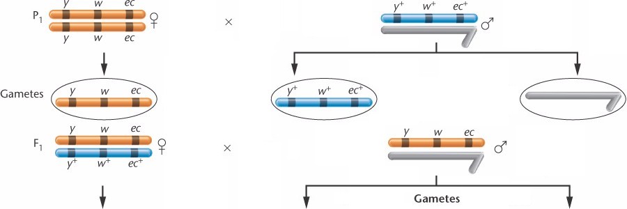 In the F1, females are heterozygous at all three loci and males are hemizygous for the mutant alleles.