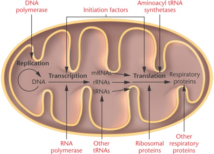 while nuclear DNA codes the rest (arrows entering the organelle). For example,