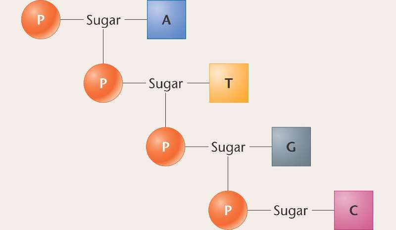 Each nucleotide is composed of a phosphate group, a sugar, and a nitrogenous base.