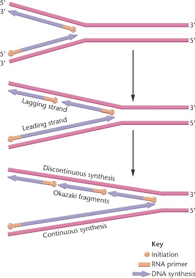Synthesis along the lagging strand must be discontinuous, occurring in Okazaki fragments, each with an RNA primer.