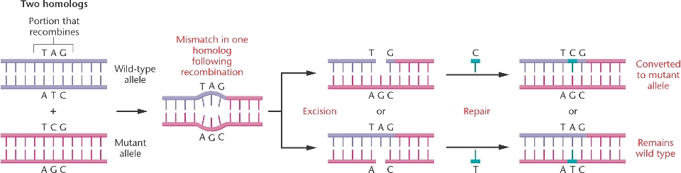 During excision repair, one of the two mismatches is removed and the complement is synthesized, leading to possible gene conversion.