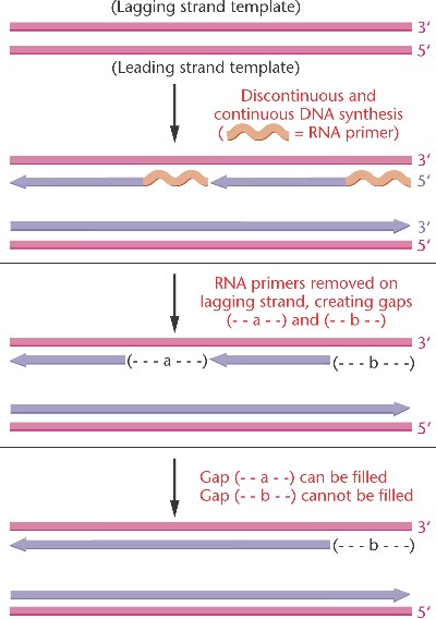 On the lagging strand, after the last RNA primer is removed, there is no free 3'-OH for DNA polymerase to elongate.