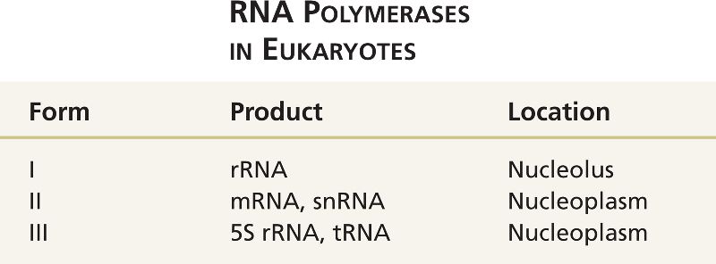 (RNP) exists in three unique forms, each of which transcribes different types of genes. Each enzyme is larger and more complex than the prokaryotic RNP.