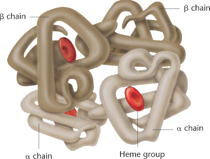two alpha and two beta chains that fit together with four heme groups in a