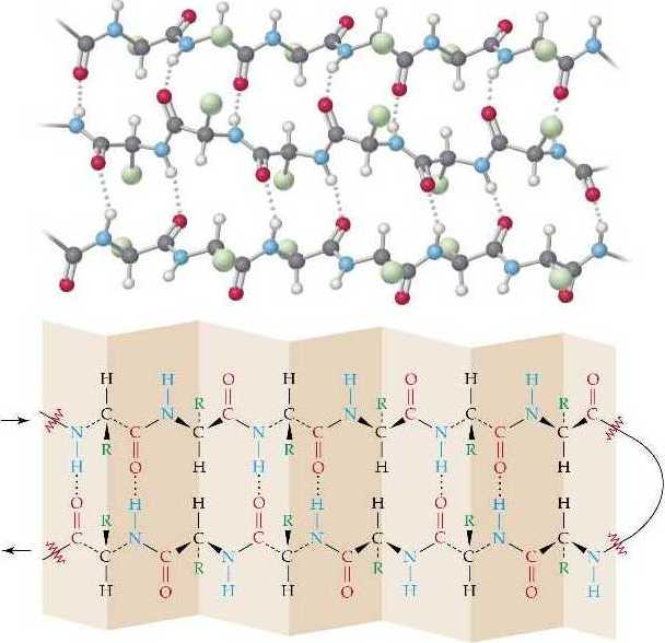 in a zigzagging plane. Extensive beta-pleated-sheet regions provides strength and rigidity to structural proteins such as the