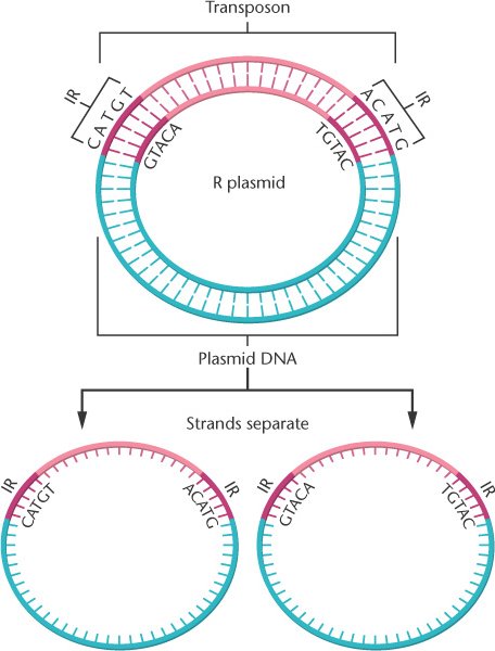 A transposon inserted into a plasmid contains inverted repeats (IR) that can form a heteroduplex after the original strands separate.