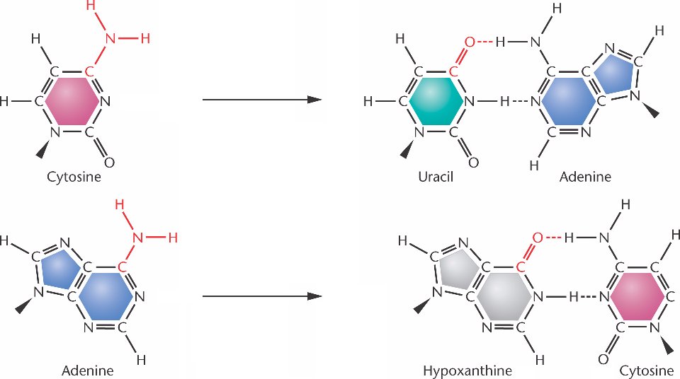 hypoxanthine (which base pairs with cytosine), respectively.