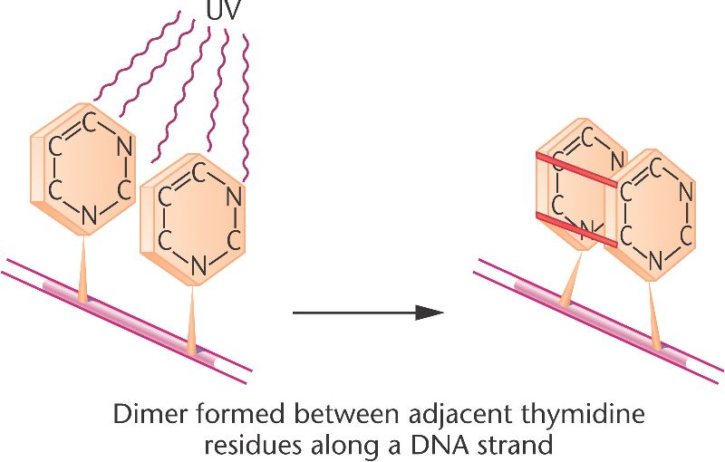 in DNA. The dimers distort the DNA conformation and result in higher error rates during DNA replication. If the erros are not
