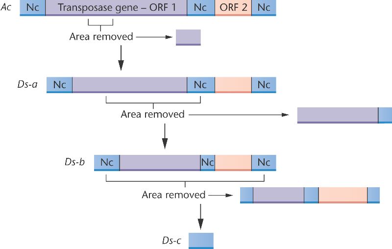 Transposons. The Ac sequence contains noncoding regions (Nc) and an open reading frame (ORF) which encodes a transposase enzyme and enables the sequence to "jump". The Nc also contains inverted terminal repeats not shown here.