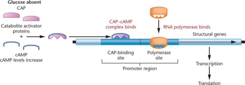 In the absence of glucose, Cyclic adenosine monophosphate (cAMP) levels increase,