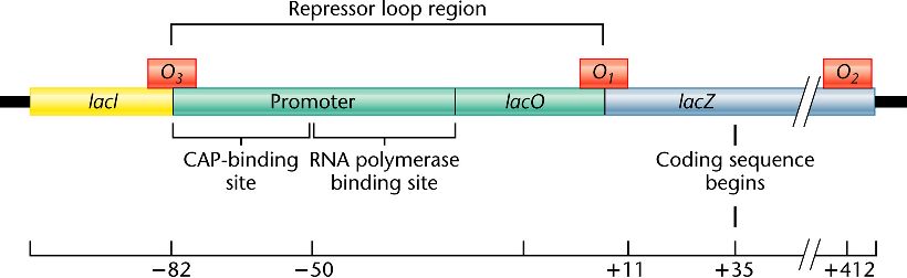 The numbers represent nucleotide sites upstream and downstream from the initiation of transcription. Binding of the repressor to operators