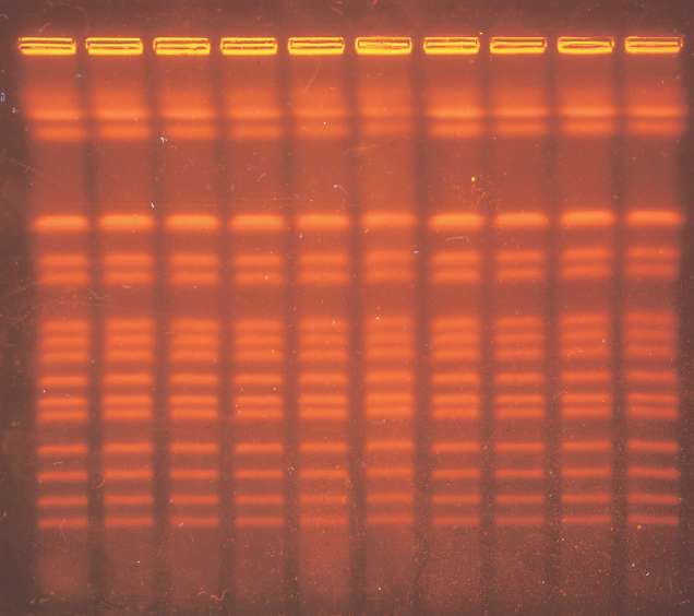 This technique can separate very large DNA pieces such as 15 of the 16 yeast chromosomes shown here, with the largest chromosomes at the top.