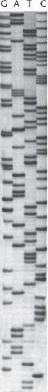 A gel showing fragments synthesized from four different dideoxynucleotide chain termination runs.