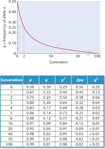 Natural selection reduces the frequency of a lethal recessive allele, a.