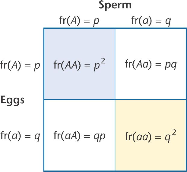 The three genotypes AA, Aa, and aa have the frequencies p2, 2pq, and q2, respectively, and these frequencies also add up to 1.