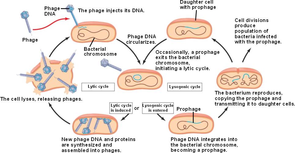 The lytic and lysogenic cycles of λ, a temperate phage.